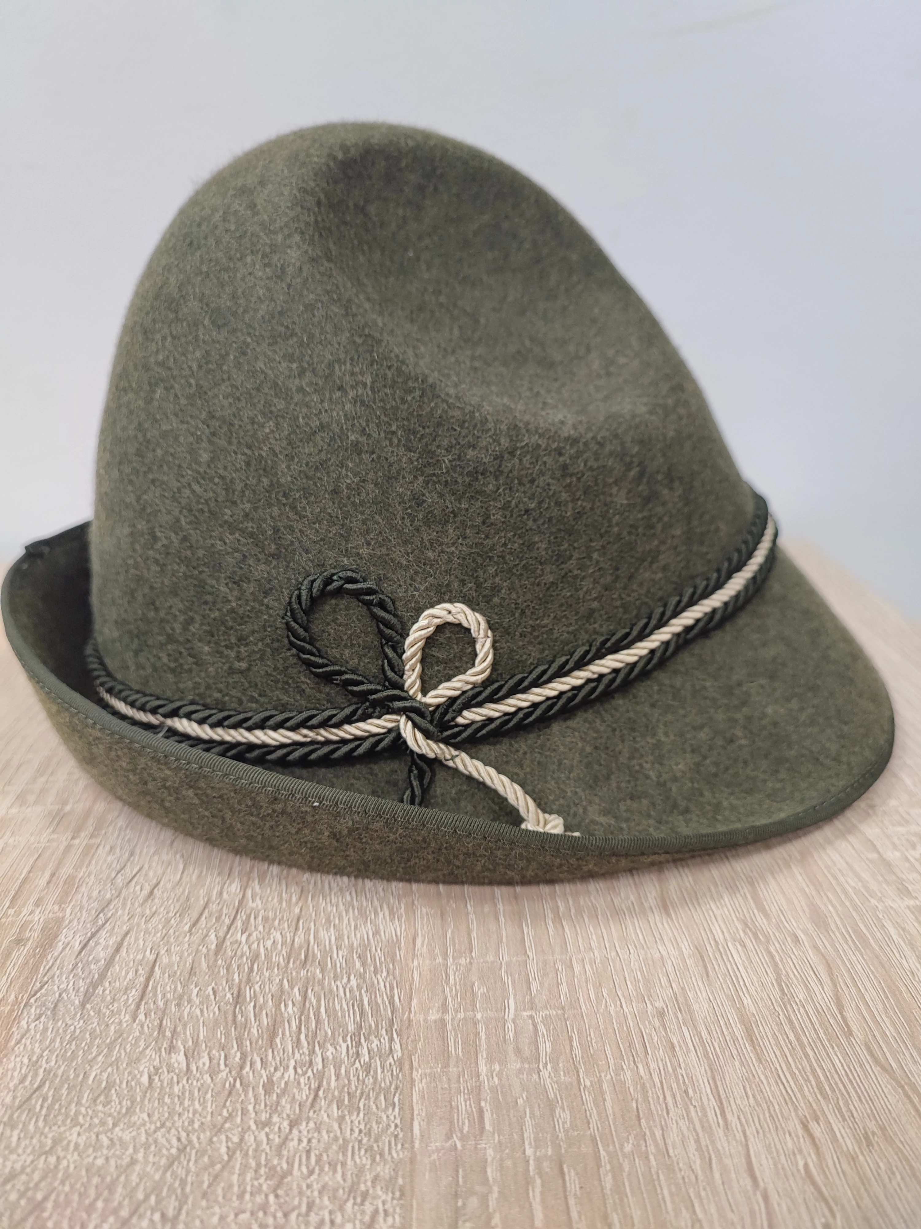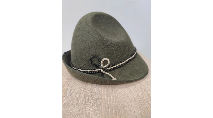 Hagyományos vadászkalap puha lóden anyagból. Karima nélkül, zsinór díszítéssel.